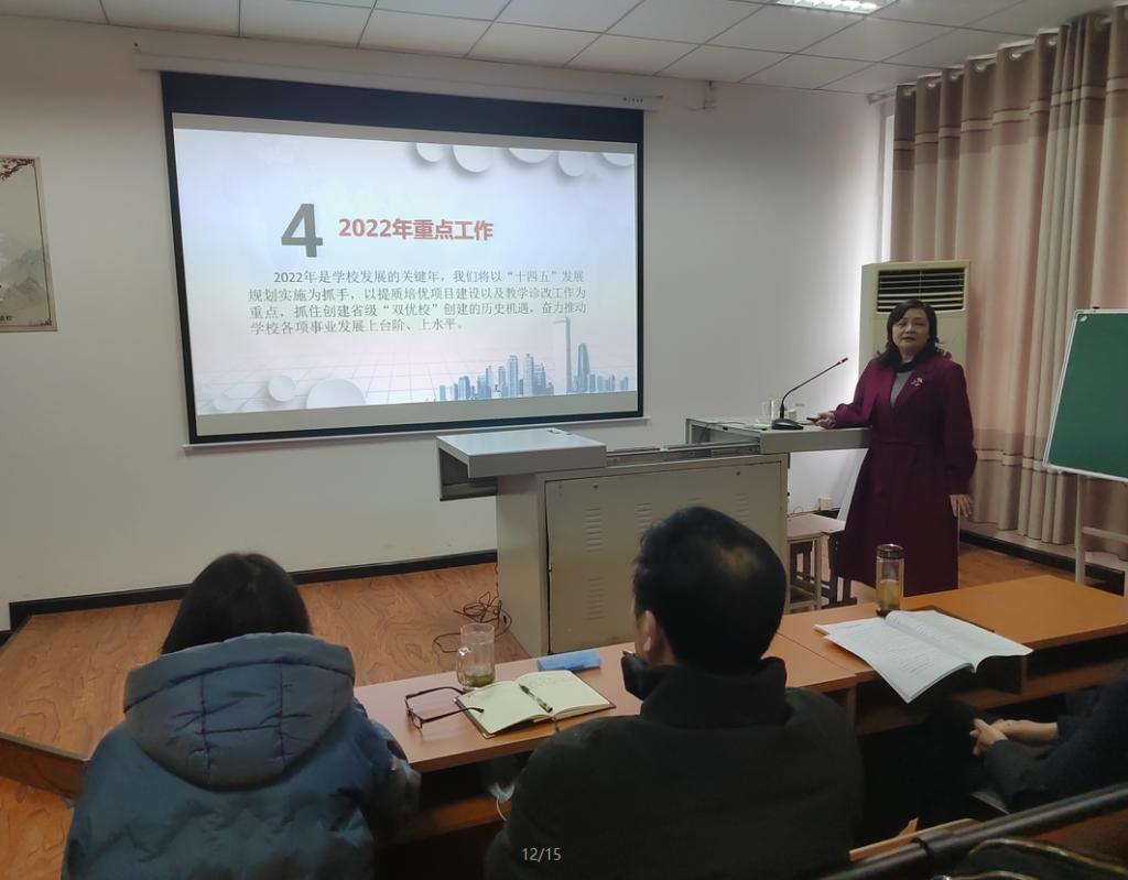 报告分四个部分,一是 “十三五”期间学校取得的成绩;二是学校“十四五”发展目标及具体任务;三是“十四五”开局之年工作回顾;四是2022年重点工作安排。王院长强调,学校正处于爬坡过坎的关键期,也正面临着新时代职业教育发展的新机遇和新挑战。全体教职员工要以时不我待、只争朝夕的紧迫感,逆水行舟、不进则退的危机感,校兴我荣、校衰我耻的责任感,担当起学校建设发展的历史重任,奋发作为,为我们早日建成“特色鲜明、区域领先”的中等职业教育名校而努力奋斗!