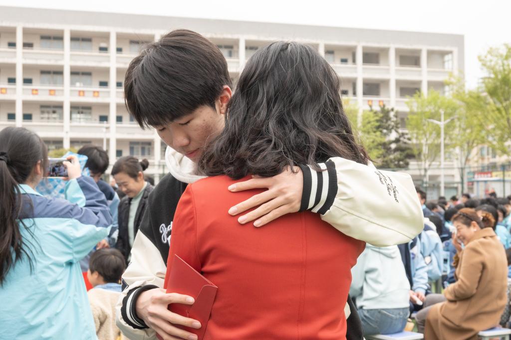 在温馨的互动环节,学生和家长交换家书,表达彼此的爱与期望,深情“三鞠躬”、拥抱,象征着亲情的力量和支持。学生们依次走过成人门,象征着他们正式迈入成人行列。学生在班主任带领下,队伍有序,口号响亮,教师们站在两旁,与学生击掌祝福,放礼花、敲大鼓,气氛热烈。