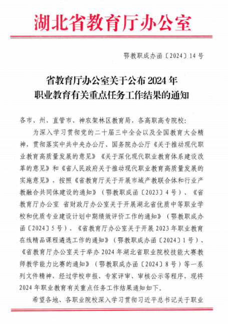 12月31日,湖北省教育厅发布《省教育厅办公室关于公布2024年职业教育有关重点任务工作结果的通知》,襄阳市工业学校在湖北省优质中等职业学校和优质专业建设中期评价中获得“优秀”等次,成为全市唯一一所获此殊荣的学校。