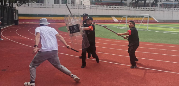 为进一步增强师生员工安全防范意识,牢固树立“反恐防恐,人人有责”的意识,提升学校防范和应对突发事件的能力,营造平安和谐的校园环境。6月20日下午,学校联合市特警支队处突小组和辖区民警在学校运动场开展了反恐防暴演练培训,学校领导、相关科室人员、保卫人员、宿舍管理员和部分学生代表参加了此次演练。