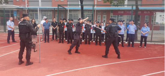 郭警官结合我校安保工作的实际情况组织保卫人员模拟了一起突发事件,一名“歹徒”持棍试图闯入校园,伤害师生。面对紧急情况,保卫人员立即作出反应,一方面及时疏散师生并拨打110报警,另一方面保卫人员持防暴器械将“歹徒”阻挡在门外并配合警官及时控制“歹徒”,成功处置突发事件。整个模拟过程,紧张有序,配合默契,达到了预期效果。