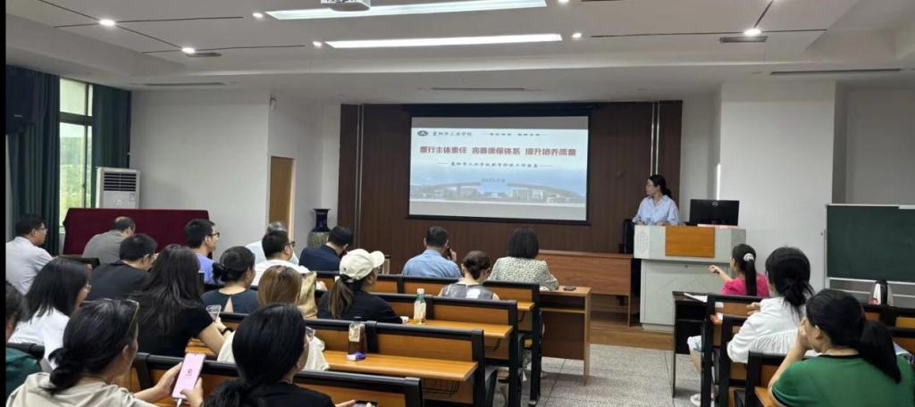 本次汇报会以"履行主体责任 完善质保体系 提升培养质量"为主题,评建办主任苏巧君率先作学校层面诊改总报告,从学校基本情况、教学诊改工作思路、学校内部质量保证体系构建等6个方面汇报学校三年诊改工作。