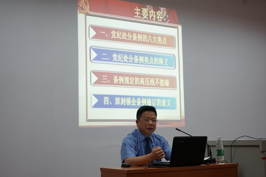 9月4日,学校开展9月份主题党日教育活动,并邀请襄城区检察院纪委书记潘家顺一行四人到校开展讲座,深刻领会《中国共产党纪律处分条例》修订的重大意义。学校全体党员参加,活动由党委副书记母永锋主持。
