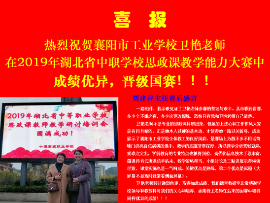 我校卫艳老师在全省中职学校思政课教学能力大赛中成绩优异,晋级国赛(市赛中为全市第一名)。
