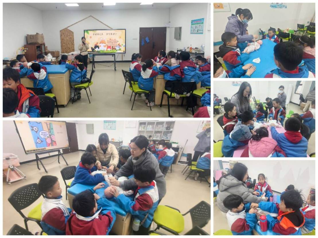 作为本次活动的重点环节,“爱心小课堂”保育体验区开展了 “穿衣小达人 护宝小卫士”专属体验活动。在温馨的模拟场景中,孩子们借助毛绒玩偶、儿童衣物和穿衣步骤图解,学习给“小婴儿”穿衣等生活照料技能,了解了幼儿营养饮食、轻微外伤处理及卫生习惯培养等知识。通过亲身体验,孩子们不仅提升了生活自理意识与动手能力,更懂得了如何照顾他人,增强了他们的爱心与耐心。